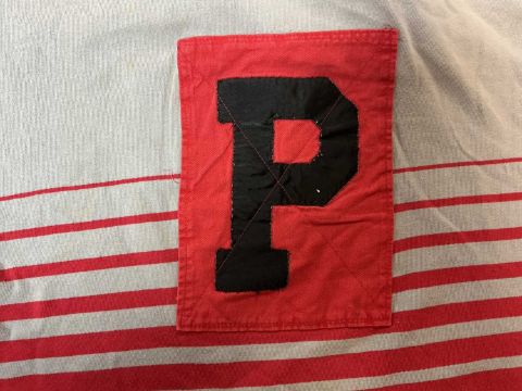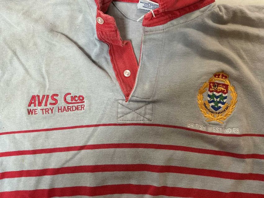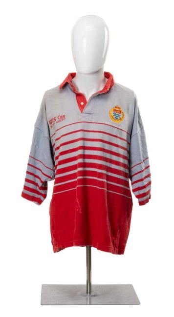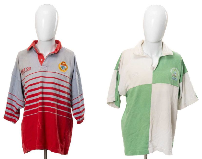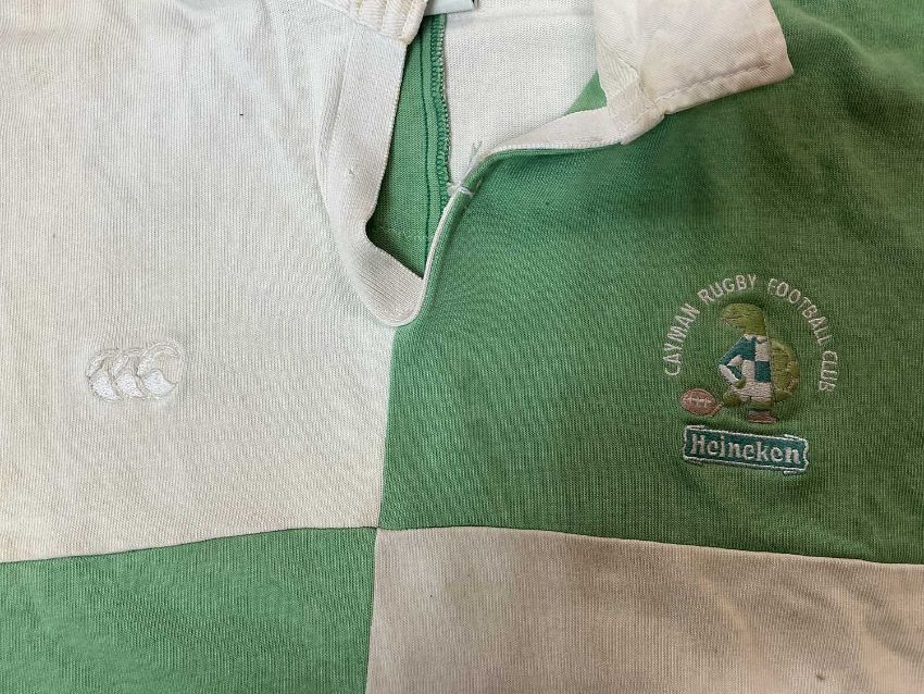 RUGBY UNION CLUB HOUSE: TWO CAYMAN ISLANDS RFC JERSEYS, likely to have been swapped after 2010 game in the Cayman Islands, grey and red short sleeved jersey, with an embroidered British West Indies motif to the left breast and motto 'He hath founded it upon the seas', the motif surrounded by a wreath and crown, with sponsorship by Avis Cico 'We try harder' to the right breast, red hoops running round the jersey and a red collar, maker's mark 'Halbro est. 1919, made in the USA', bearing a red patch and a black vinyl letter P to the rear; together with a photograph of the player Bob Chambers wearing the jersey; and green and white panelled short sleeved jersey, bearing 'Cayman Rugby Football Club' embroidery over a turtle mascot dressed in rugby kit with a rugby ball, Heinekens sponsorship underneath, right breast with Canterbury logo, white cotton panel with black no. 12 to rear, inside collar with 'Canterbury of New Zealand, Made in USA' labelThe South Wales Police club toured May 2010 and visited the Cayman Islands, where they met the local team. The game was played in George Town and the Police won 24-21.Likely to be donated by Bob Chambers, who played in the Cayman Islands whilst seconded there.Provenance: South Wales Police RFC collection (raising funds for the club to attend The World Police & Fire Games in 2027)Comments: some sun staining from display, some stretching on green and white jersey, please see images