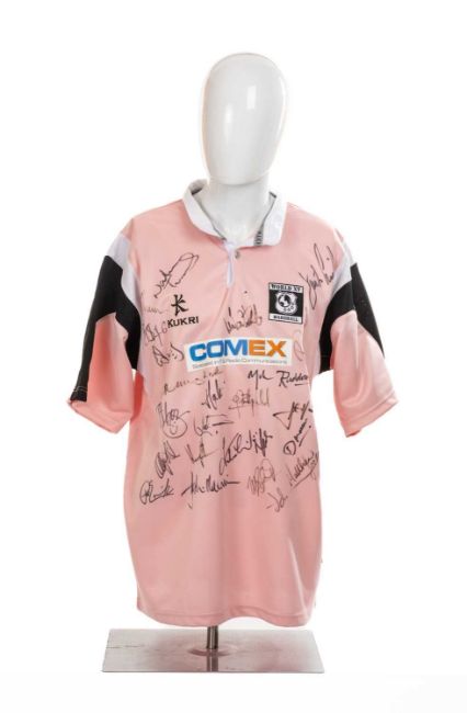 RUGBY UNION CLUB HOUSE: JUSTIN MARSHALL XV VS. SHANE WILLIAMS XV TESTIMONIAL MATCH SIGNED JERSEY, 2008, Kukri pink jersey with one button, embroidered 'World XV Marshall' emblem embroidered to right breast, maker's Kukri emblem to left breast and sponsor details, ink signatures of players including Justin Marshall and others such as Ryan Powell and Paul Emerick, framed and glazed, 101 x 70cmsProvenance: private collection Blaenau GwentComments: not removed from frame