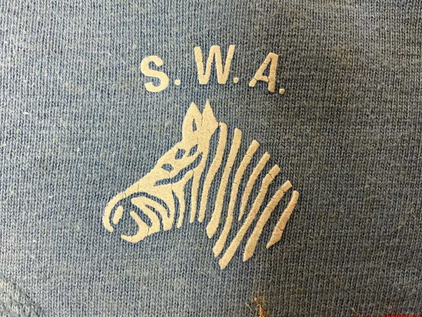 RUGBY UNION CLUB HOUSE: SOUTH WEST AFRICA (NOW NAMIBIA) INTERNATIONAL JERSEY, blue and red hooped, bearing a printed zebra logo and the initials SWA, white patch with red no. 5 sewn to rear, knitted cuffs, maker's mark 'Maxmore', size 44"/112cmsNote: believed to be from the 1980s, when South West Africa was governed by South Africa before Namibia gained independence in 1990Provenance: South Wales Police RFC collection (raising funds for the club to attend The World Police & Fire Games in 2027)Comments: some sun staining from previous display, please see images
