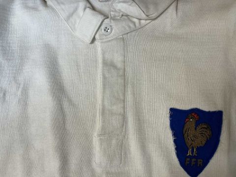 RUGBY UNION CLUB HOUSE: PIERRE ALBALADEJO FRANCE NO. 10, White match worn jersey against Wales in 1963, applied shield embroidered Gallic rooster with F.F.R, three button collar, vinyl no.10 in black applied to rear, 'Allen Sports Paris, 42, Rue Etienne-Marcel' maker's label applied to inner collarDavid Watkins played five times against France in the Five Nations from 1963-67. In 1963 and 1964 he opposed Pierre Albaladejo, while in 1965 and 1966 it was Jean Gachassin. In 1967 it was Guy Camberabero. France played in white against Wales in 1963, 1965, 1966 and 1967. In 1964 they wore blue in the 11-11 draw in Cardiff. The swap for the white jersey is thought to be with Albaladejo. That means it would have had to have been in 1963 after a 5-3 win for France in Paris. The jersey has the ‘Allen Sport’ label, a stitched blue cockerel on the front and a solid plastic No 10 on the back. Born in Dax on 14 December 1933 he won 30 caps for France from 1954-64, scoring 108 points. Included among that total were 12 drop goals, earning him the nickname ‘Monsieur Le Drop’. France shared the Five Nations for the first time in 1954 after he broke into the side for the final two matches. He played against Wales and Ireland as the French went unbeaten throughout the championship for the first time – they drew with England – in 1960. They were unbeaten champions once again in 1961. He played in four Top 14 finals with Dax, losing all of them, and was twice a winner of the Challenge Yves du Manoir competition. He is still alive at the age of 91 and living in Dax.Provenance: the David 'Dai' Watkins Collection, by descentComments: display staining to front chest, please see imagesAuctioneer's Note: The Vendor suggested that both French jerseys were swaps with Pierre Albaladejo. He played against David Watkins in 1963 (White) and 1964 (Blue). In the other three games Watkins played against France he was opposed by Jean Gachassin (1965 and 1966 in White) and Guy Camberabero (1967 in White)