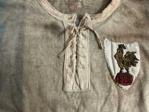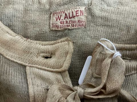 RUGBY UNION CLUB HOUSE: 1929 / 1931 FRENCH JERSEY MATCH-WORN BY FERNAND CAMICAS OR CHARLES PETIT v Wales, with shield patch bearing the Gallic rooster (Le Coq Gaulois) and rugby ball with the letters FFR (Fédération Française de Rugby / French Rugby Federation), blue jersey with a strung collar bearing six string holes, white felt no. 1 to the rear, white knitted cuffs and collar, inner collar with sewn-on patch 'Sports W. Allen, 42 R.Etien.Marce. Télép. Louvre 14-10 Paris'From the Jack Bassett collection via South Wales Police as Bassett played against France in 1929 and 1931. He missed the 1930 game because he was sailing to New Zealand with the British & Irish Lions. The French used to number their side in the current style of 15-9 in the backs and 1-8 up front. In 1929, Wales won 8-3 at Cardiff Arms Park on 23 February and the match programme has Fernand Camicas wearing the No 1 jersey. His debut came two years earlier in a game against Germany and the game in Cardiff was the ninth of his 10 caps. Born in Tarbes in 1899, he died in the same city aged 74 in 1973. In 1931, the match programme for the game on 28 February 1931 at St Helen’s, Swansea, has Charles Petit wearing the No 1 jersey. It was Petit’s debut and it turned into an unhappy one as Wales won 35-3. This was his only cap, so it seems unlikely he would have swapped. He went on to win seven caps for the French rugby league team, playing against Wales in 1936.Provenance: South Wales Police RFC collection (raising funds for the club to attend The World Police & Fire Games in 2027)Comments: faded, some minor holes to the fabric No.1 to rear of the jersey, please see images