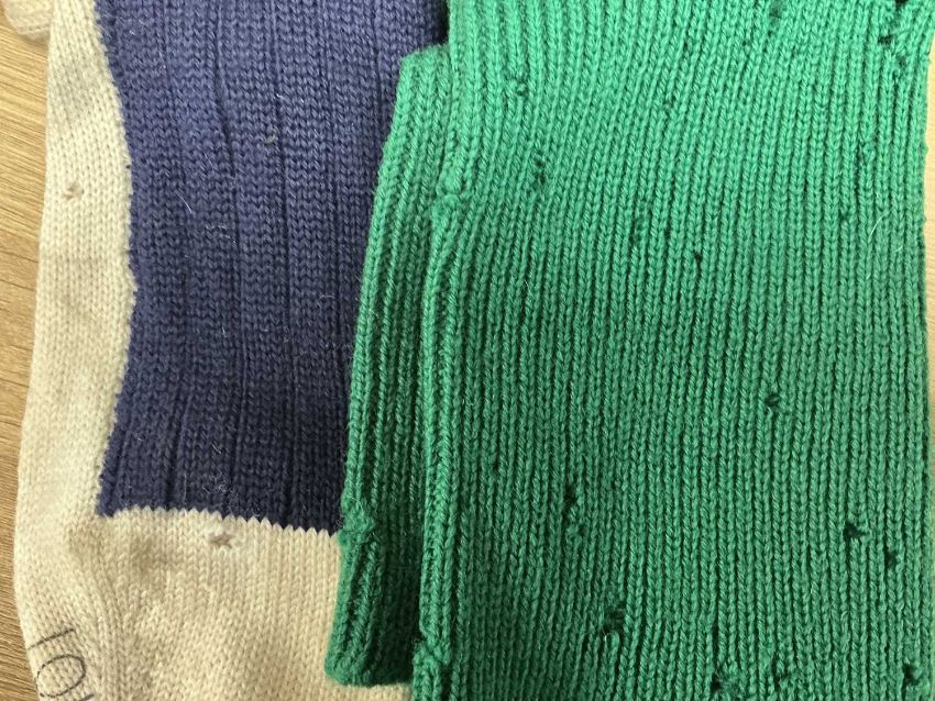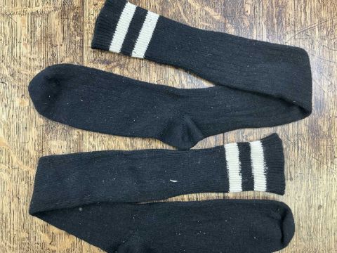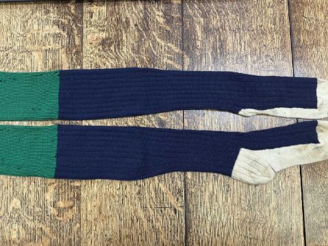 RUGBY UNION CLUB HOUSE: THREE PAIRS OF INTERNATIONAL SOCKS for Lions - All Blacks – Springboks,These are examples of the heavy duty woollen socks worn by players during the Sixties. The British & Irish Lions socks – Blue with Green turnover at the top - are from the 1966 tour to Australia, New Zealand and Canada tour that David Watkins went on. The All Blacks socks – Black with two White hoops at the top – are also believed to have come from that tour. The Springbok socks – Green with Gold top – come from David’s 1964 trip for the 75th anniversary celebrations and the Wales tour.Provenance: the David 'Dai Watkins' Collection, by descentComments: matchworn, some holes to wool from stretching, please see images