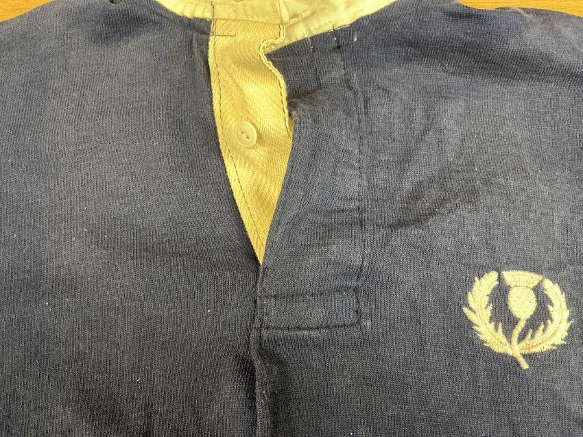 RUGBY UNION CLUB HOUSE: SCOTLAND REPLICA JERSEY, inner collar label EllisPark Sports, size 38, pre-professional and sponsorship era white jersey with embroidered thistleThis is a Seventies/Eighties style Scotland replica jersey that was in the vendor’s collection to illustrate Scottish rugby.Provenance: private collection South Africa