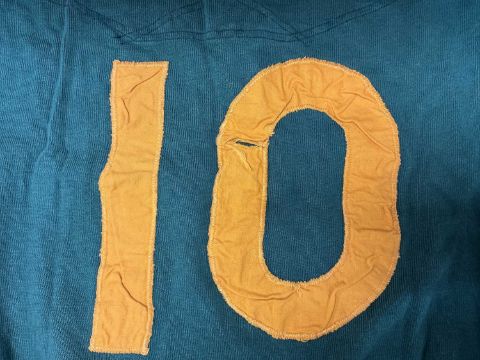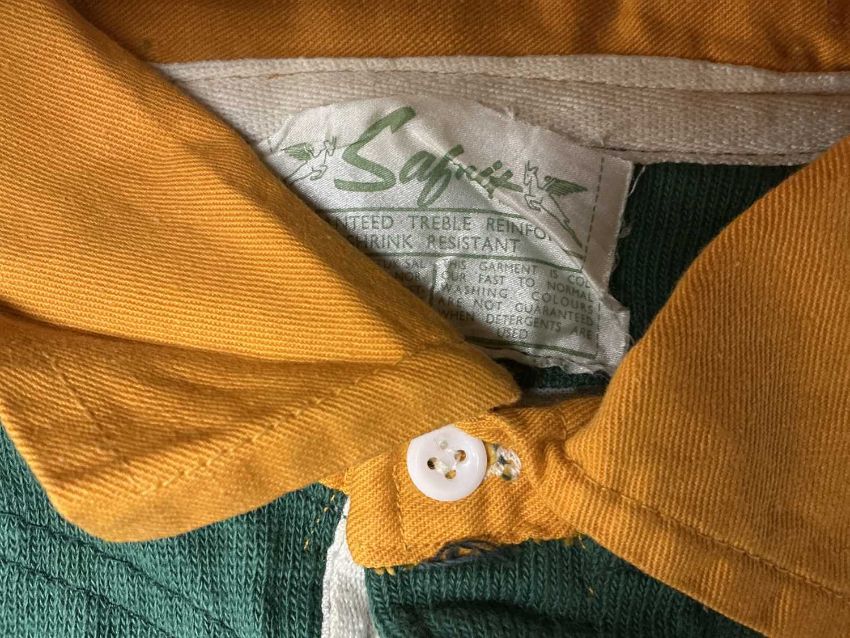 RUGBY UNION CLUB HOUSE: KEITH OXLEE PRESIDENT’S XV SARB 75TH JUBILEE JERSEY, green No. 10 from jubilee series, applied patch embroidered right breast, fabric gold no. 10 to rear, quilted shoulders, inner label 'Safnit' manufacturersDavid Watkins played opposite Keith Oxlee in the final game in the SARB 75th Jubilee Series. The President’s XV played in Springbok jerseys with a special badge that had SA Rugby 1889 – 1964 beneath the Springbok crest. This completes the No 10 shirts from the match played in Cape Town.Provenance: the David 'Dai' Watkins Collection, by descentComments: small tear to rear no.10, some fading, please see images