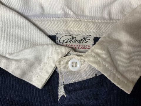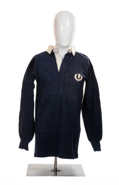 RUGBY UNION CLUB HOUSE: DONALD WHITE OR IAIN LAUGHLAND SCOTLAND FIVE NATIONS JERSEY, match worn with vinyl no. 12, embroidered Scottish thistle emblem, inner maker's mark 'R.W. Forsyth Ltd, Edinburgh & Glasgow, Size 40', three button collarDavid Watkins played against Scotland four times – 1963, 1964, 1965 and 1966 – and was a winner on each occasion. He played at outside half in e very game, but this jersey is a swap with a Scottish centre. The jersey is made by Forsythe’s, the long standing maker of Scottish jerseys. His first Scottish opponent wearing the No 12 jersey was Kevinside Academicals centre Donald White. He was only 19-years-old and was winning the second of his four caps in the 1963 season Kelvinside Academicals. He went to Oxford University and never played for Scotland after that season. Playing at outside half against Watkins at Murrayfield in 1963, the infamous game of 111 line-outs and won 6-0 by Wales, was Iain Laughland. A very famous London Scot he won 31 caps for his country at outside half and centre. It was he who switched to centre and played against Watkins in the No 12 jersey in 1964, 1965 and 1966. He captain Scotland twice in victories over Ireland and England in 1966. Like Watkins, he was a brilliant seven-a-side player and was captain of the London Scottish team that won the Middlesex Sevens five times under his leadership. Injury prevented him from joining Watkins on the 1966 British & Irish Lions tour. He became president of the Scottish rugby union in 2000.Provenance: the David 'Dai' Watkins Collection, by descent