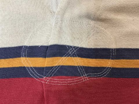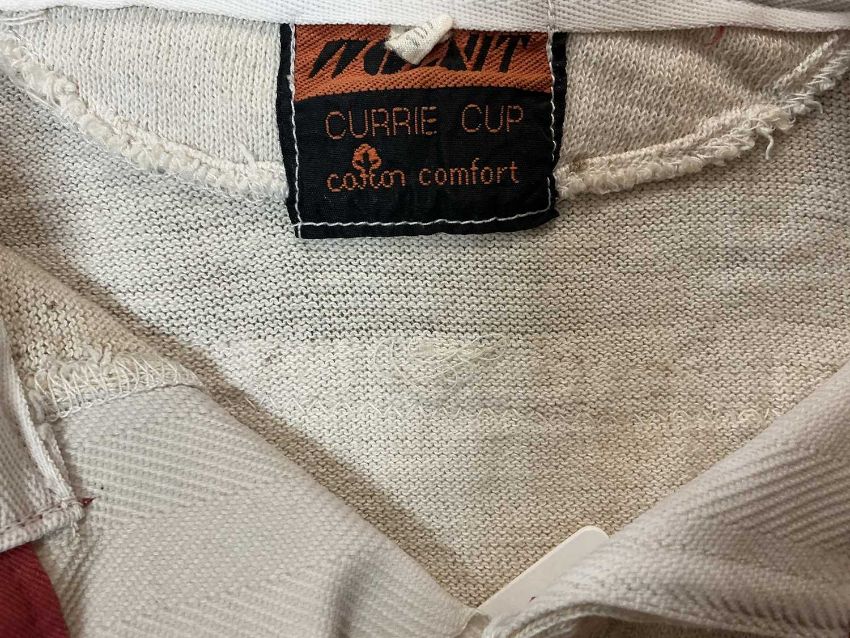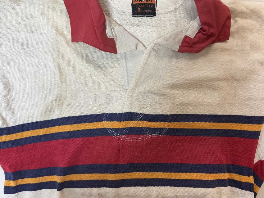 RUGBY UNION CLUB HOUSE: UNIVERSITY OF PRETORIA JERSEY, bearing horizontal red, blue and yellow stripes, with a two button red collar, knitted cuffs, sewn patch white patch to the rear with felt no. 17 thereon, label 'Wolnit Currie Cup Cotton Comfort' on patch on the inner collarProvenance: South Wales Police RFC collection (raising funds for the club to attend The World Police & Fire Games in 2027)Comments: fading in areas, small tear to left shoulder area, please see images