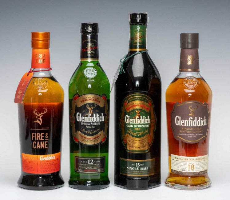 WINE, WHISKY & SPIRITS CLUB HOUSE: FOUR BOTTLES OF GLENFIDDICH MALT WHISKY, comprising 15yo Cask Strength, 51%, 1 litre; 18yo Small Batch Reserve, 40%, 70cl; Fire & Cane (Smoky Whisky finished in sweet Rum casks), 43%, 70cl; 12yo Special Reserve, 40%, 70cl (4)Provenance: private collection Rhondda Cynon TafComments: all in excellent condition