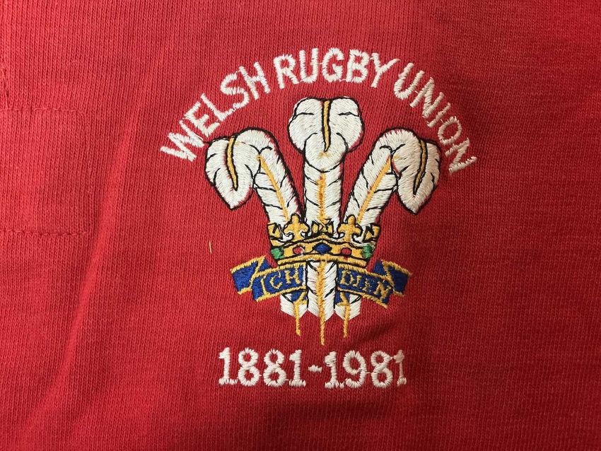 RUGBY UNION CLUB HOUSE: 1981 WELSH RUGBY UNION CENTENARY UNUSED SQUAD JERSEY, embroidery to the right breast 'Welsh Rugby Union 1881-1981' with the Prince of Wales feathers and motto 'Ich Dien', no number to the rear, white collar with two buttons, label 'The Choice of Champions, Umbro International, To Fit size XOSM, Made in England' to the inner collarWales played a series of special games at the National Ground, Cardiff Arms Park to celebrate their centenary in the 1980-81 season. Special jerseys were produced for the games against an Overseas XV and the WRU President’s World XV. There was also a game between a Combined Wales & England XV against Scotland & Ireland. 25 April 1981: Wales 27 – 21 WRU President’s World XV Terry Holmes crossed for two late tries to clinch victory for the Welsh side and bring down the curtain on the centenary celebrations. Wales won by five tries to two against a World XV that boasted a potent back line. This win came after a disappointing Five Nations campaign in which Wales won two of their four games. This was an uncapped game for Wales. Wales: Gwyn Evans (Maesteg); Clive Donovan (Maesteg), Ray Gravell (Llanelli), David Richards (Swansea), Clive Rees (London Welsh); Gareth Davies (Cardiff), Terry Holmes (Cardiff); Ian Stephens (Bridgend), Alan Phillips (Cardiff), Graham Price (Pontypool), Geoff Wheel (Swansea), Allan Martin (Aberavon), Clive Burgess (Ebbw Vale), Rhodri Lewis (Cardiff), Jeff Squire (Pontypool, captain) World XV: Gysie Pienaar (South Africa); Brendan Moon (Australia), Andy Slack (Australia), David Johnson (Scotland), Andy Irvine (Scotland); Mark Ella (Australia), Dave Loveridge (New Zealand); Phil Orr (Ireland), Peter Wheeler (England), Mick Fitzpatrick (Ireland), Bill Beaumont (England , captain), Andy Haden (New Zealand), Jean-Pierre Rives (France), Mark Shaw (New Zealand), Rob Louw (South Africa) Replacement: Louis Moolman (South Africa) for Rives Provenance: South Wales Police RFC collection (raising funds for the club to attend The World Police & Fire Games in 2027)Comments: some light staining, please see images