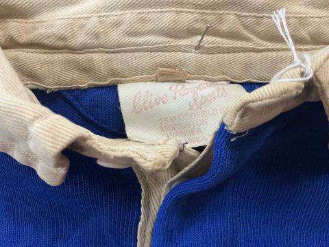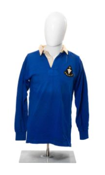 RUGBY UNION CLUB HOUSE: SOUTH WALES POLICE RFC JERSEY, blue jersey with white collar, applied patch motif with a crown over Prince of Wales feathers, with initials S.W.P.R.F.C., white patch with black no. 11 to the rear, elasticated cuffs, maker's mark to the inner white collar of 'Clive Rowlands Sports, 25 Woodfield Street, Morriston, Swansea'Provenance: South Wales Police RFC collection (raising funds for the club to attend The World Police & Fire Games in 2027)Comments: good, some light sun staining to chest, please see images