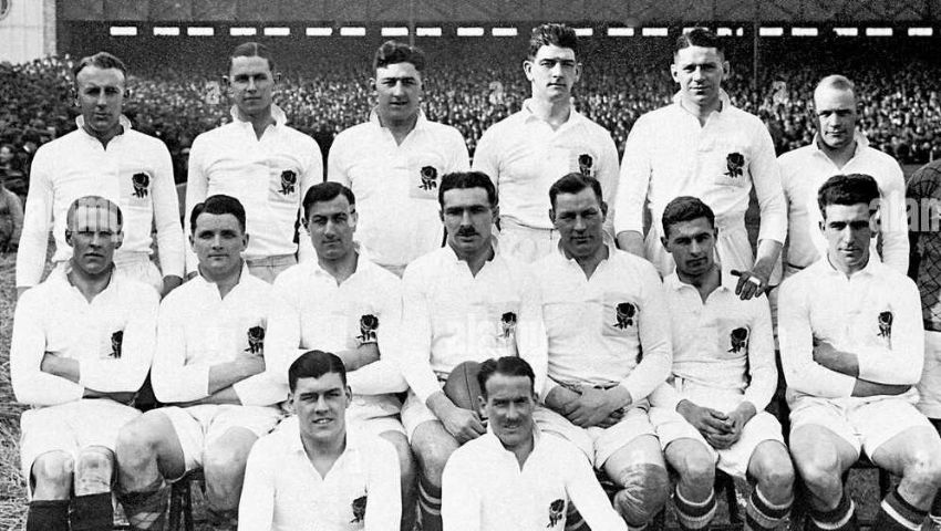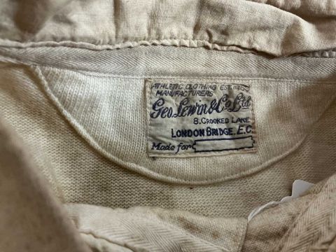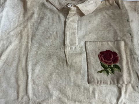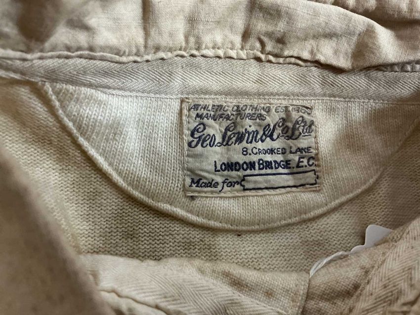 RUGBY UNION CLUB HOUSE: 1932 ENGLAND INTERNATIONAL JERSEY MATCH-WORN BY CARL AARVOLD, an embroidered rose to the right breast pocket, three buttons to a white collar, no number to the rear, knitted cuffs, bearing label 'Athletic Clothing Manufacturers, Est. 1869, Geo. Lerwin & Co. Ltd, 8. Crooked Lane, London Bridge. E.C.', non-numberedJack Bassett lent a lot of the memorabilia he collected during his career to be displayed at an exhibition in Kenfig Hill in 1934. Among the items listed in The Glamorgan Advertiser, Friday 27 April 1934, as being loaned is a jersey from “C. D. Aarvold, England, 1932”. Carl Aarvold, or, to be more accurate, Sir Carl Douglas Aarvold OBE, TD, was capped 16 times by England and led his country six times. He played against Jack Bassett in 1929, 1930 and 1932. The two men also toured with the British Lions in New Zealand in 1930. When they opposed each other in the 1932 Five Nations Championship they were both captains of their country. This jersey has no number, but the stitched on English Rose on the front is in keeping with the international jerseys of the time. The number would have been stitched onto the back and could easily have come off. The Prince of Wales attended the game at St Helen’s, Swansea, and both Bassett and Aarvold introduced their teams to him before kick-off. It was 0-0 at half time and Wales had the benefit of the wind after the break. Wales went on to win 12-5 in a dominant display that broke a decade long wait for a win over England. Their previous triumph had been in 1922. Aarvold went on to make his mark worldwide in the legal profession, including presiding at the 1965 trial of the Kray twins. He served in the Royal Artillery, reaching the rank of lieutenant colonel during the Second World War, and was awarded an OBE in 1945 for his war service. He was promoted to be senior judge at the Old Bailey in 1964 and knighted in 1968.Sir Carl Aarvold Born in Hartlepool on 7 June 1907, he died on 17 March 1991 in Westhumble, Surrey, aged 81. He was educated at Durham School and Cambridge University. He served in the Royal Artillery and reached the temporary rank of Lieutenant-Colonel during WW2. He was appointed Officer of the Order of the British Empire (OBE) in 1945 for his war service and also received the Territorial Decoration. His legal career saw him become the Recorder of Pontefract in 1951 and then Judge of the Lord Mayor's and City of London Court. He was also Master of the Inner Temple before becoming Recorder of London, the Senior Judge at The Old Bailey in 1964. He was knighted in 1968 and for nearly 20-years served as the president of the Lawn Tennis Association. He won 16 caps for England, earned a Grand Slam in his debut season in the side in 1928 and went on the Lions tours to Argentina in 1927 and New Zealand and Australia in 1930. He captained the Lions in three of the five Tests in New Zealand. Provenance: South Wales Police RFC collection (raising funds for the club to attend The World Police & Fire Games in 2027)Comments: staining and fading where displayed, cuff split at seam, please see images
