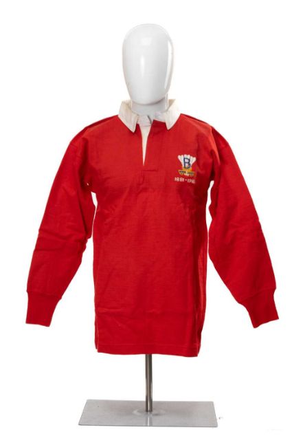 RUGBY UNION CLUB HOUSE: 1981 WALES- B INTERNATIONAL JERSEY, embroidered Prince of Wales feathers with motto 'Ich Dien' and '1881-1981 Centenary Seasons' to the chest, with a blue embroidered 'B' over the top of the feathers, no number to the rear, label 'The Choice of Champions, Umbro International, 107cm/42"'Provenance: South Wales Police RFC collection (raising funds for the club to attend The World Police & Fire Games in 2027)Comments: light staining in areas where displayed previously, otherwise good, please see images