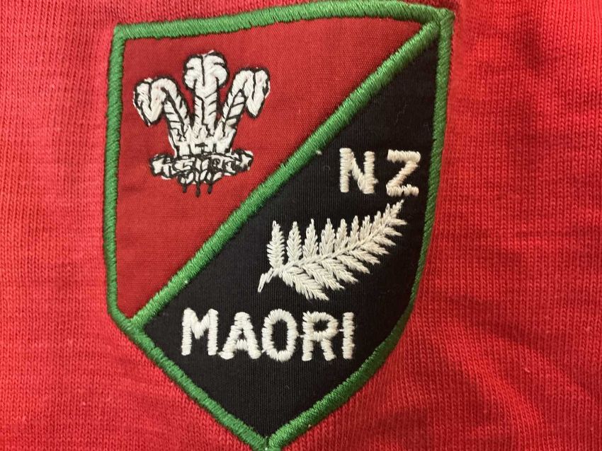 RUGBY UNION CLUB HOUSE: MĀORI ALL BLACKS & WALES JERSEY, red with a white collar bearing three buttons, the emblems of the Wales and New Zealand teams, the Prince of Wales feathers and the silver fern, within a shield embroidered to the chest surrounded by green, no number to the rear, label 'The Choice of Champions, Umbro International, Size OS Mens, Made in England' to inner collarProvenance: South Wales Police RFC collection (raising funds for the club to attend The World Police & Fire Games in 2027)Comments: good condition, please see images