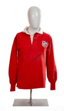 RUGBY UNION CLUB HOUSE: WILIE JOHN MCBRIDE BRITISH & IRISH LIONS REPLICA JERSEY, signed across front, embroidered Lion's shield to left breast, maker's mark Maxmore, ink signature across chestThis replica jersey is signed across the chest of a British & Irish Lions shirt by Willie John McBride. The second row remains one of Irish and British rugby’s greatest players and leaders. He won 63 caps for Ireland from 1962-75, captain his country 11 times, and was in the first Irish side to beat the Springboks (1965) and the first Home Nations team to win away in the southern hemisphere in Australia (1967). Born in Toomebridge, County Antrim in 1940, he played his club rugby forBallymena and was not only made CBE for his services to rugby, but also inducted into the World Rugby Hall of Fame in 2009. He is one of the most famous Lions of all-time and holds records that are never likely to be broken. He played on five tours and played in 17 Tests, the last 15 consecutively. He helped the Lions to win their first series in New Zealand in 1971 and then captained the 1974 side on an unbeaten tour of South Africa. It total, he played 70 times for the Lions from 1962-74.Provenance: private collection South Africa