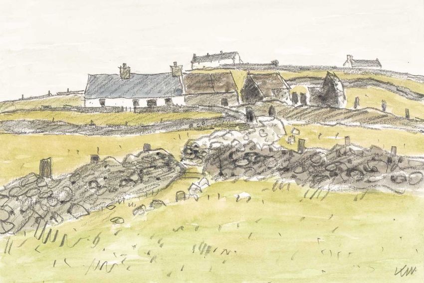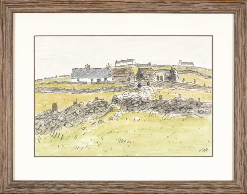 ‡ SIR KYFFIN WILLIAMS RA (1918-2006) watercolour and graphite - landscape with cottages and dry stone walls, signed with initials, 27 x 40cmsProvenance: private collection GwyneddComments: framed, glazed