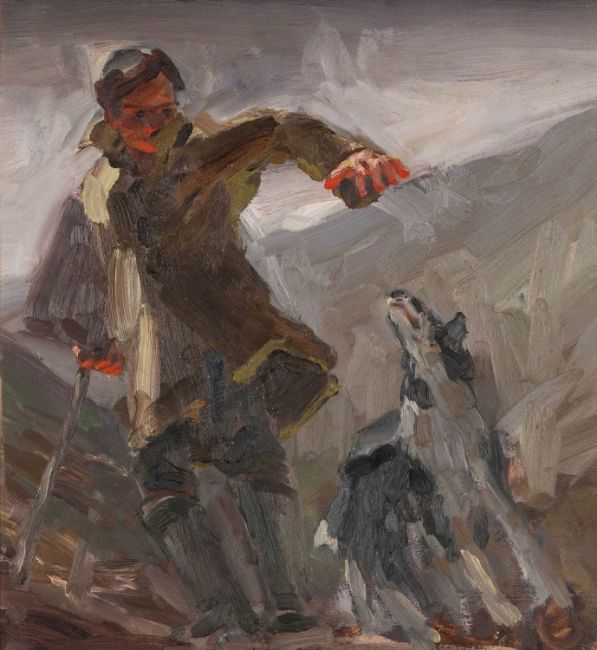 ‡ KEVIN SINNOTT (b. 1947) oil on panel - entitled verso, 'The Artist and His Dog' on Martin Tinney Gallery label, signed with initials, dated verso 1995, 37 x 34cmsProvenance: private collection WorcestershireComments: framed