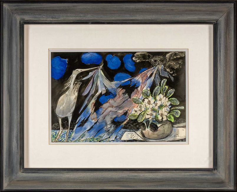 ‡ CERI RICHARDS CBE (1903-1971) pencil, pen, brush, black ink and gouache - entitled verso, 'Homage to Dylan Thomas' on Kooywood Galley label, signed, 35 x 52cmsProvenance: private collection Vale of Glamorgan, coincidentally a similar slightly smaller work was sold at The Welsh Sale in July 2025 (£9000 hammer price) Comments: glazed, box frame, glass is a little loose bottom corner