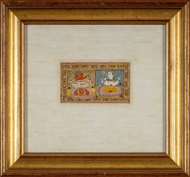 SMALL INDIAN MINIATURE PAINTING, depicting Ganesha and Vishnu holding lotus, within floral meander border, 26 x 24cmsProvenance: private collection PowysComments: framed and glazed.