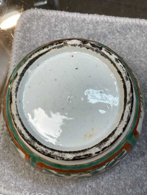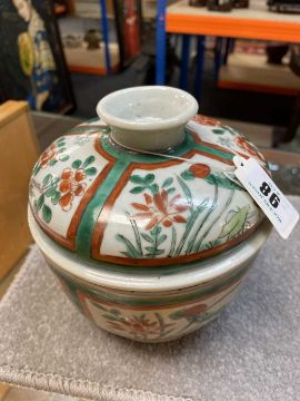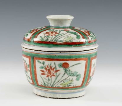 CHINESE WUCAI PORCELAIN BOWL COVER, Transitional/Kangxi, decorated with the panels of insects and lotus, peony, chrysanthemum and plum blossom reserved on green ground, with thin underglaze blue lines, 14 (h) x 15cms (diam.)Provenance: private collection Cardiff.Comments: old chip to inner rim, crack to body.