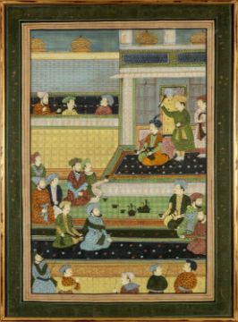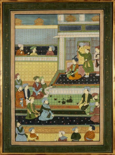 LARGE INDO-PERSIAN MINIATURE-STYLE PAINTING, depicting a court scene in a palace, with courtiers having tea, 108 x 80cmsProvenance: private collection PowysComments: framed and glazed.