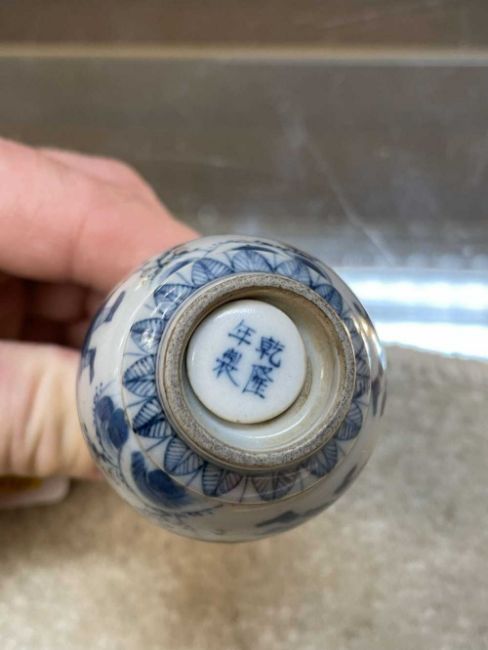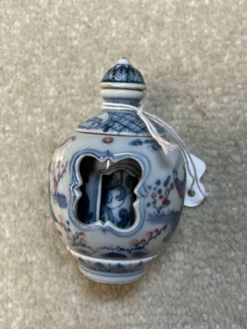 CHINESE UNDERGLAZE RED & BLUE PORCELAIN SNUFF BOTTLE, unusual triple-walled section, having revolving elements within, base with apocryphal four-character Qianlong mark, 7cms (h)Provenance: private collection South WalesComments: good overall