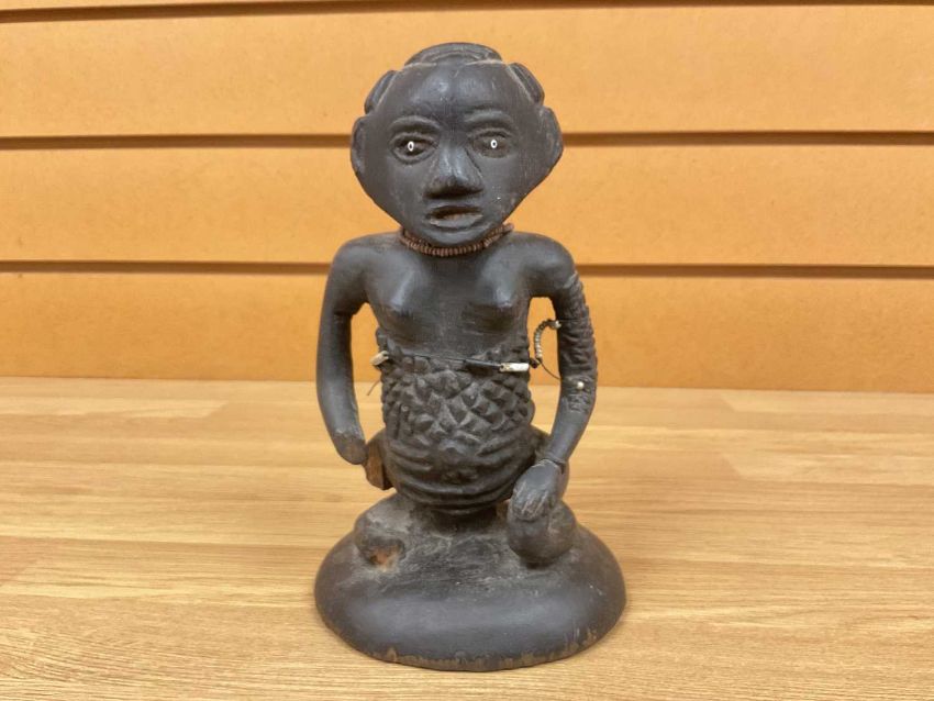 LUBA FEMALE FIGURE, D.R. Congo, kneeling with scars to abdomen and arm, beaded ornaments, bead inset eyes, low domed base, 18.5cms (h)Provenance: private collection Cardiff.Comments: coiffure broken to rear, one arm and leg broken, inspection advised.