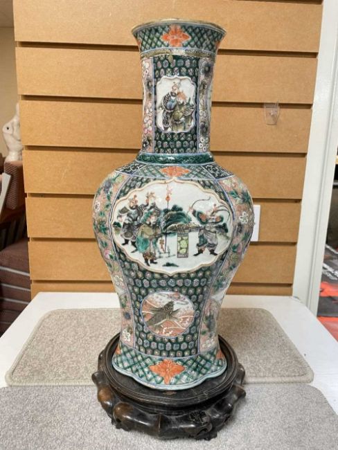 CHINESE FAMILLE VERTE PORCELAIN BALUSTER VASE, late Qing Dynasty, oval quatre-lobed section, decorated with cusped, double-gourd and fan-shaped panels of Manchu warriors, leaping carp chasing flaming pearl, qilin, flower baskets etc, reserved on cell diaper and seeded flowering peach grounds, base with recessed square cartouche (vacant), later wood stand, 42cms (h)Comments: private collection Rhondda Cynon TafComment: good overall