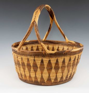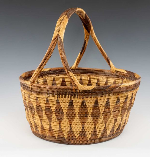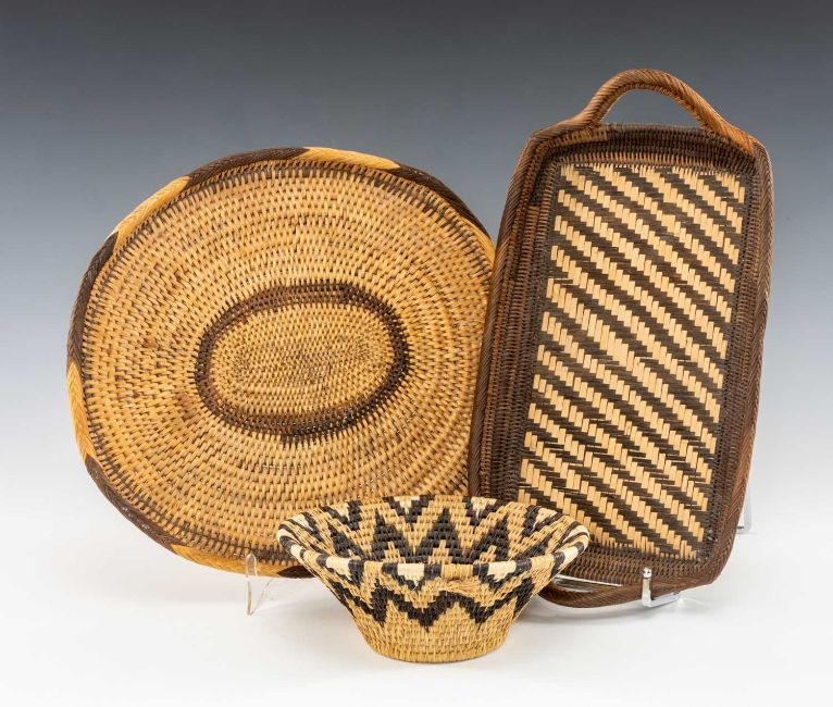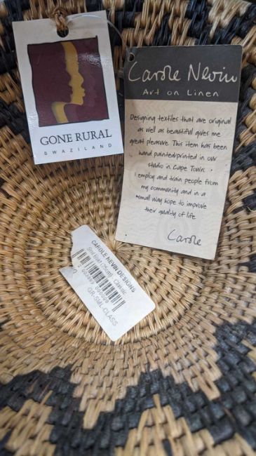 FOUR SWAZI BASKETRY HANDICRAFTS, including large circular basket with overhandle, 46cms h, two smaller trays and a bowl (4)Provenance: private collection Cardiff.Comments: good overall, bowl with retailer's label.
