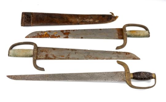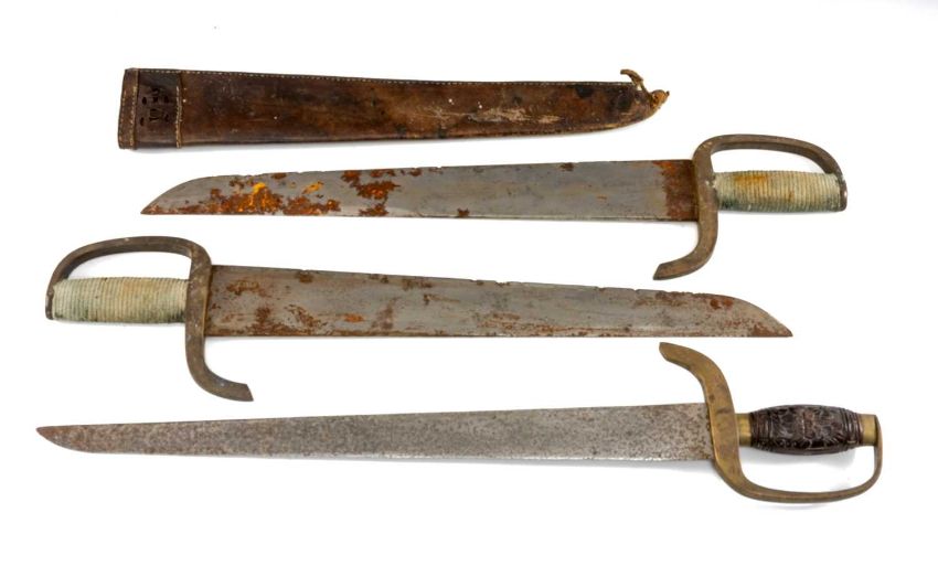 PAIR OF CHINESE 'BUTTERFLY' SWORDS, HUDIEDAO with cord grip, heavy brass half hilts, in single leather scabbard, overall length 54.5cms; together with another similar with carved wood grip, overall length 58.5cms (3)Provenance: private collection AngleseyComments: blades with corrosion.Buyer to collect only, no couriers. Proof of ID required upon collection.