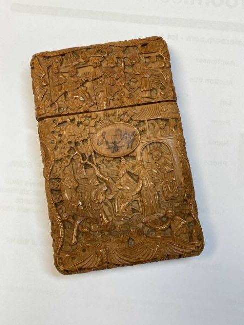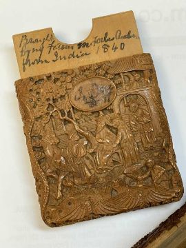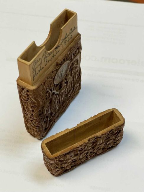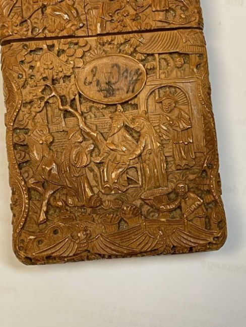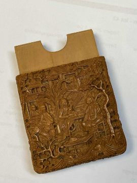 CANTONESE WOOD CARD CASE, Daoguang, carved in shallow relief with figures on terraces, oval cartouche inscribed in ink, internally inscribed and dated 1840Provenance: private collection CardiffComments. small crack and minute chips.