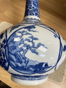 CHINESE BLUE & WHITE PORCELAIN BOTTLE VASE, neck painted with densely scrolling lotus, above cloud collar and insect and prunus shoulder, 6 leaf-shaped panels decorated with flowers alternating with landscapes, stiff leaves at the foot, base with stylised 6-character zhuanshu Wanli mark between dragons, 43cms (h)Provenance: private collection Monmouthshire