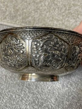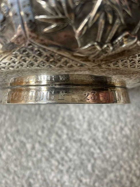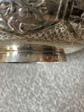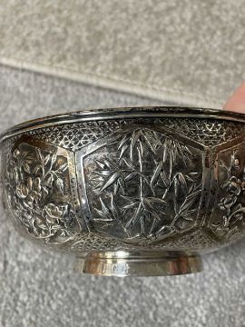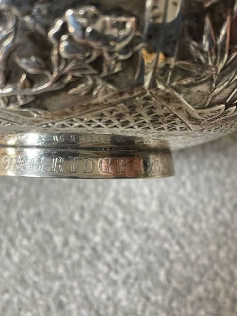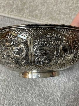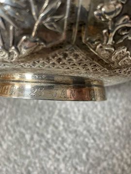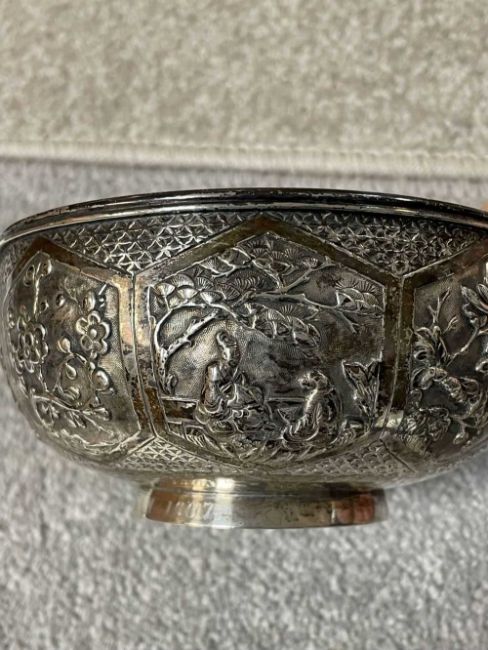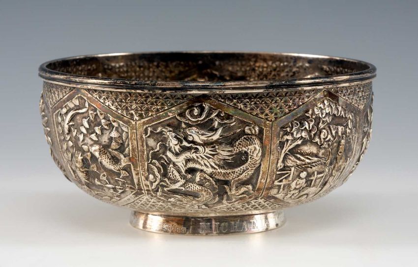 CHINESE SILVER SUGAR BOWL, by Wang Hing, c. 1900, cast to the outside with eight hexagonal panels depicting dragons, figures, flowers, etc., between diaper bands, short everted foot ring engraved with presentation inscription dated '1907' and hallmarks for the maker, 12cms (diam.)Provenance: private collection Monmouthshire