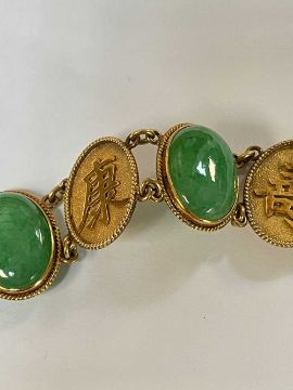 CHINESE 18CT GOLD & JADEITE BRACELET, alternating oval shou-character and cabochon apple green jadeite panels, 28gProvenance: private collection Glamorgan