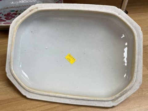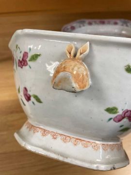 CHINESE FAMILLE ROSE PORCELAIN 'FLORAL' TUREEN, COVER & STAND, Qianlong, boldly painted with colourful European flowers in puce and coloured enamels, animal head handles, scrolled knop and deep stand, stand 36cms (w)Provenance: private collection MonmouthshireComments: under dish riveted repair, some wear to enamels