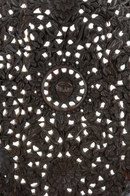 INDIAN CARVED HARDWOOD NURSING CHAIR, Bombay Presidency, shaped balloon back pierced with foliage and sun motif, circular drop-in seat on similarly carved apron, bird and lion mask front legs and foliate scrolled back legs, 93cms (h)Provenance: private collectionComments: back cracked and some glued repairs, inspection advised