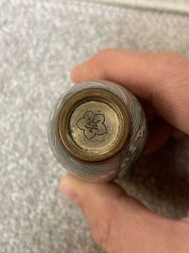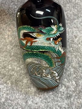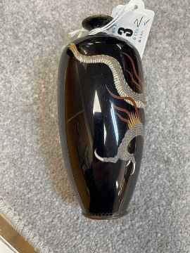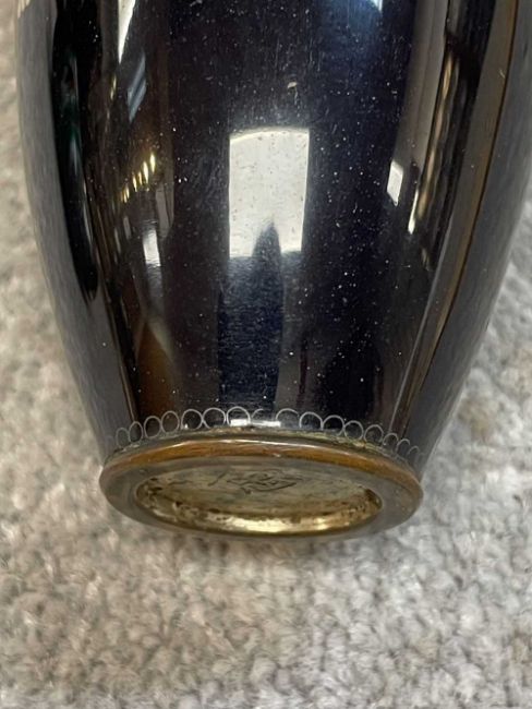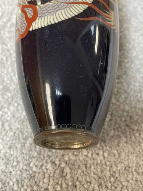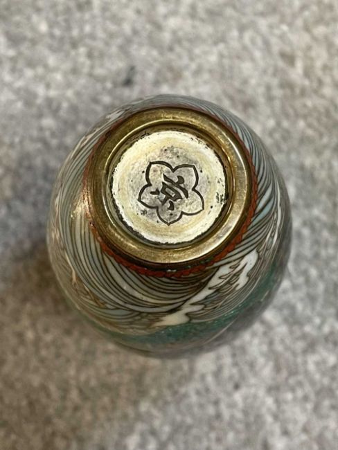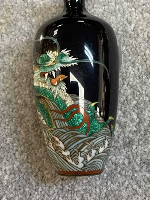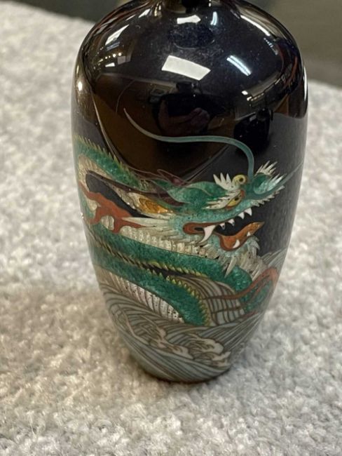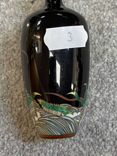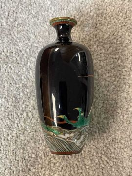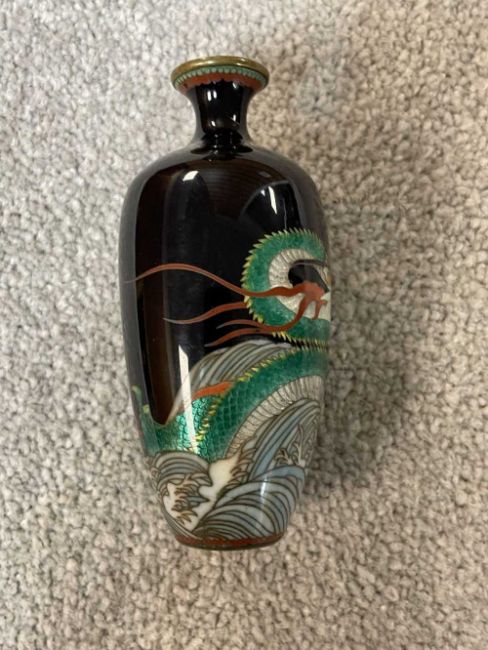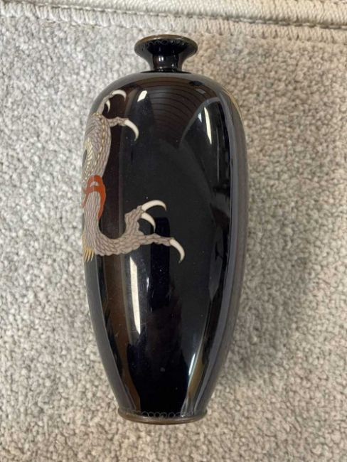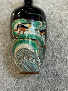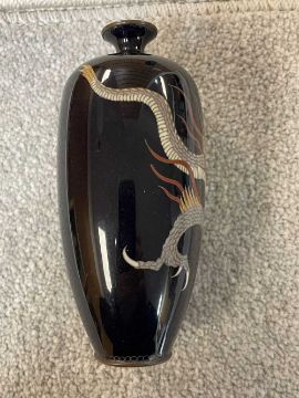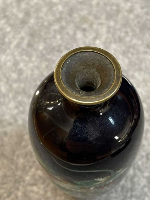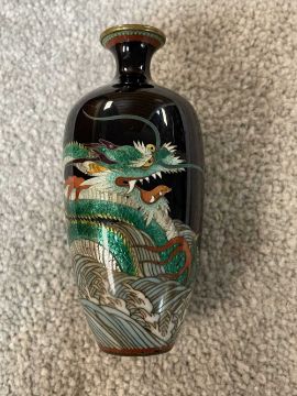 TWO JAPANESE CLOISONNÉ ENAMEL VASES, Meiji Period, one decorated with a sinuous three-clawed dragon on a deep blue ground, base with single-character mark for Hayashi Chuzo, 12cms (h); other smaller and with dragon emerging from waves, single-character mark in sakura-shaped cartouche, 9cms (h) (2)Provenance: private collection PowysComments: