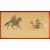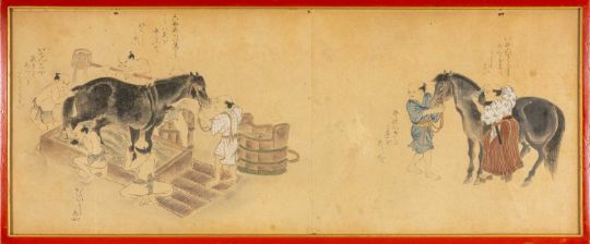 FIVE JAPANESE EDO SCHOOL PAINTINGS, 20th C, of Japanese horses and riders with grooms, including one depicting the horse being washed by attendants, in orange lacquer frames, largest 26 x 66cms (5)Provenance: private collection Cheshire