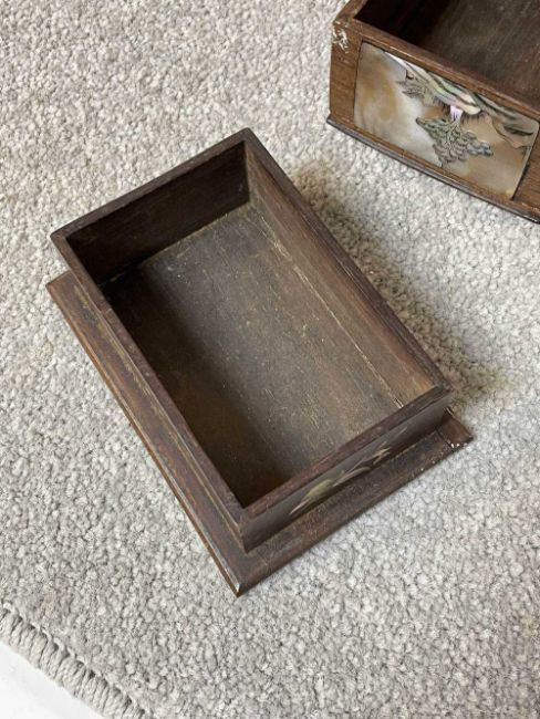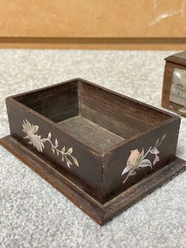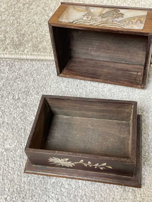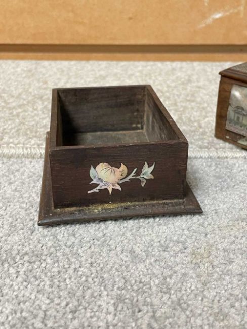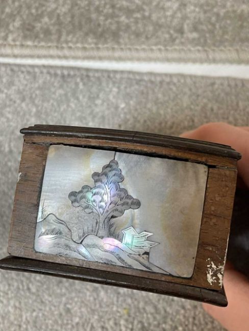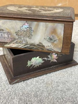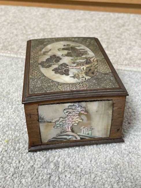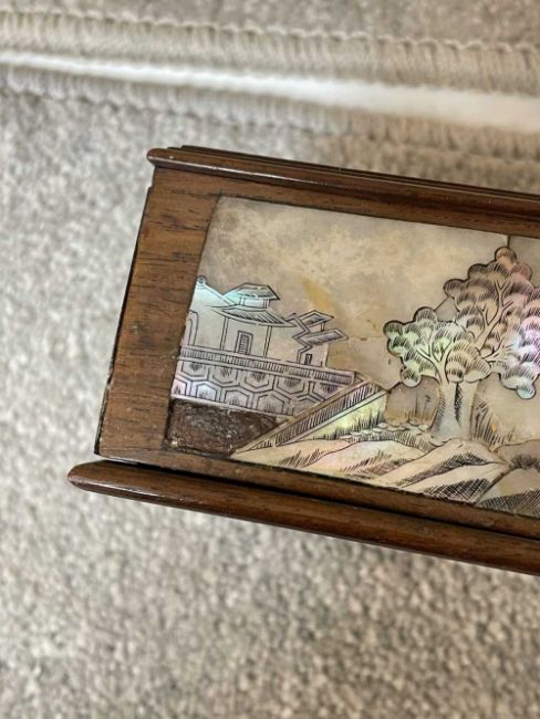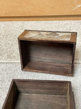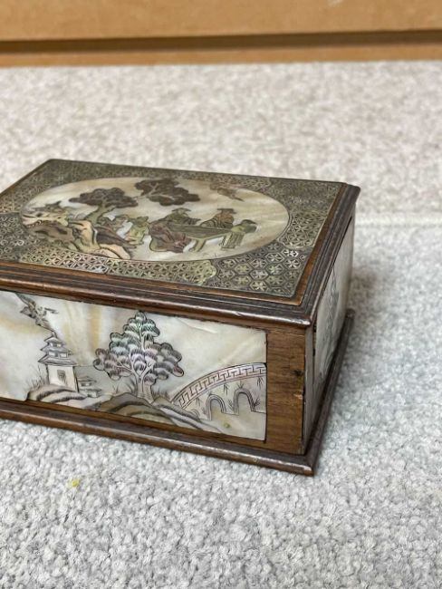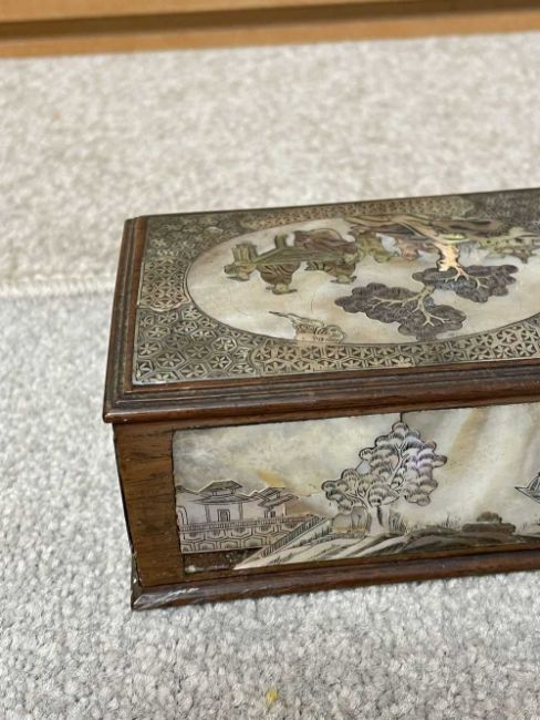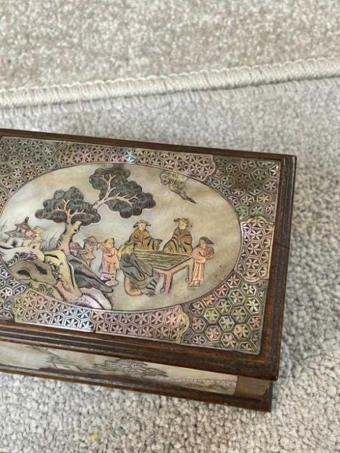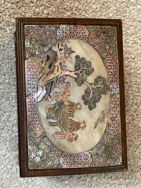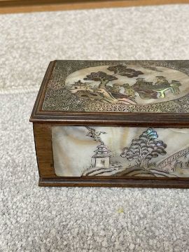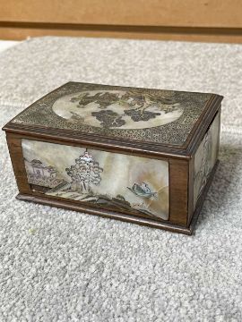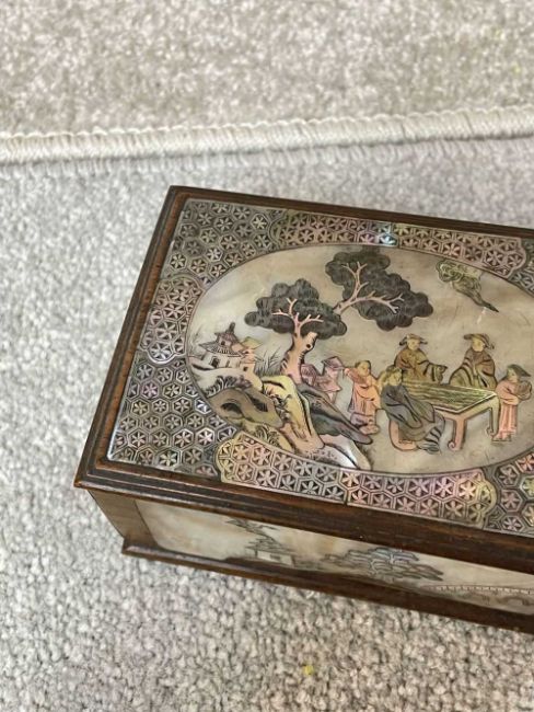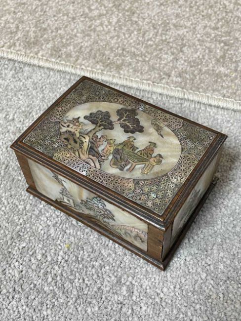 SMALL CHINESE HARDWOOD INCENSE BOX & COVER, inllaid with mother of pearl and decorated with an oval medallion depicting scholars and attendants in a garden, brocade border, further landscape panels to the sides, 10.5cms (w)Provenance: private collection MonmouthshireComments: top slightly warped, one landscape side panel missing, some mother of pearl damaged, inspection advised