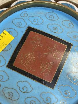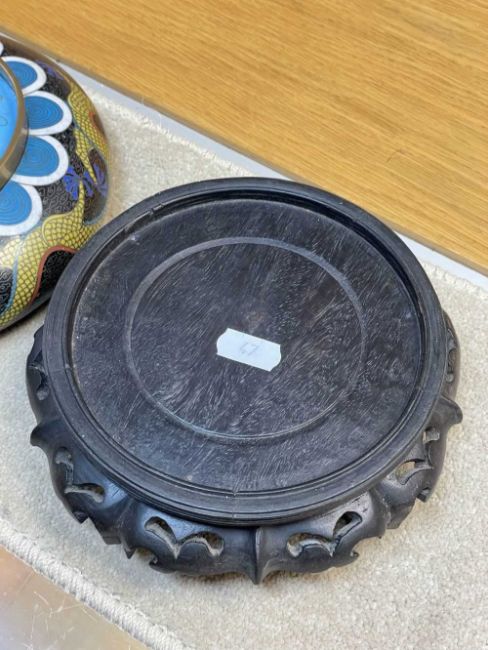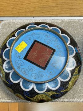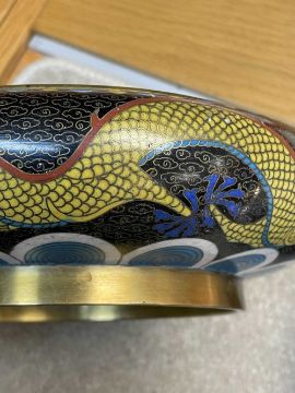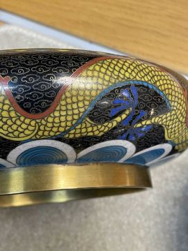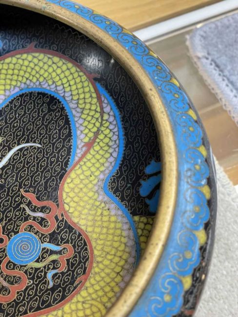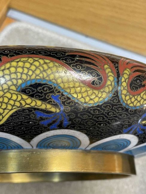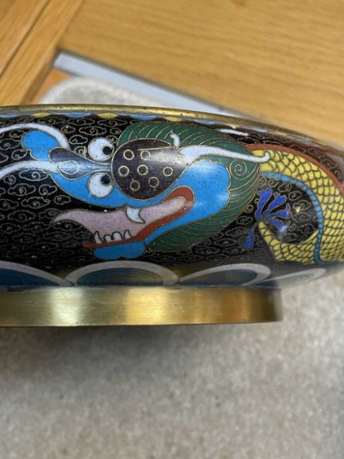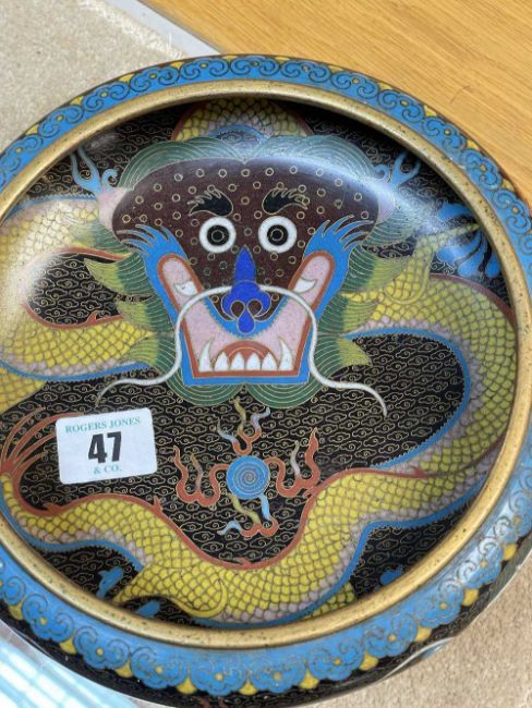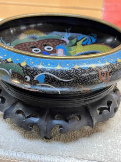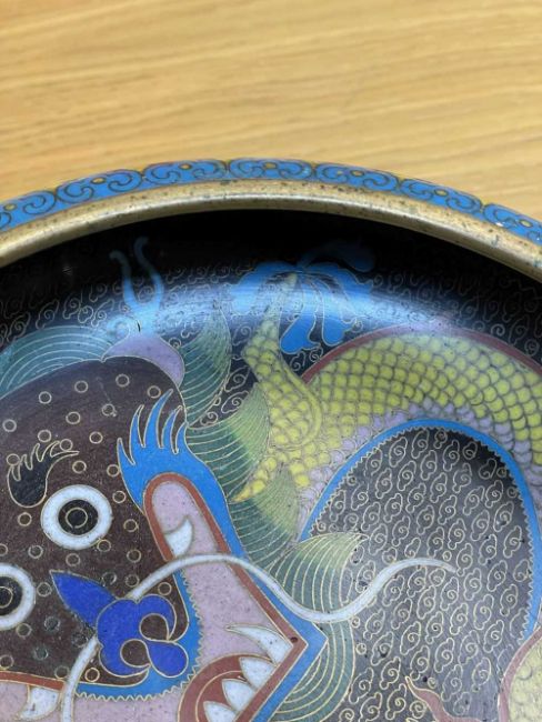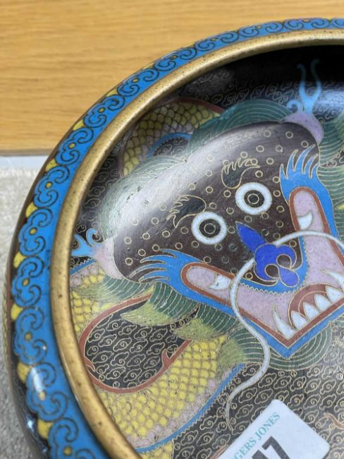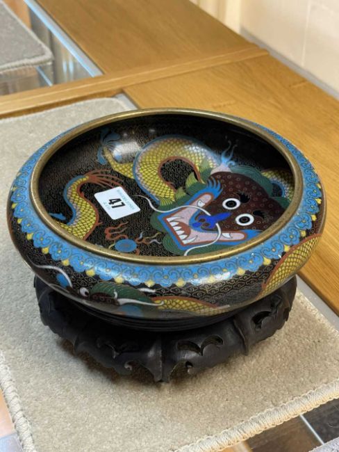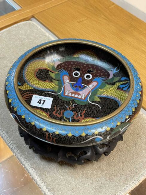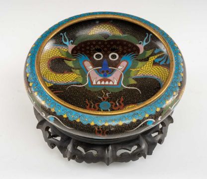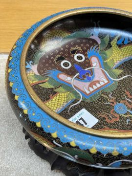 CHINESE CLOISONNÉ ENAMEL BRUSH WASHER, decorated with fearsome five-clawed dragon and flaming pearl to both inside and exterior, 20.5cms (diam.), on ebonised wood standProvenance: private collection Vale of Glamorgan