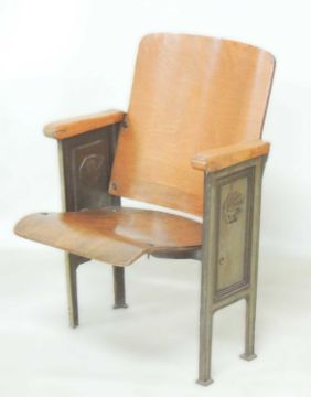 VINTAGE CAST IRON & BENT PLYWOOD THEATRE SEAT, c. 1920, side panels cast with an Aladdin lamp, folding seat, 81 (h) x 57cms (w)Provenance: The collection of Philip Clarkson