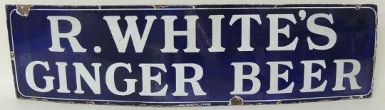 R. WHITE'S GINGER BEER ENAMEL SIGN, by the Patent Enamel Company, London, 135 x 36cmsProvenance: The collection of Philip ClarksonComments: enamel chips at the edges, including a large chip top left