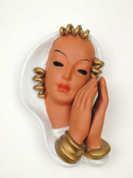 GOLDSCHEIDER ART DECO WALL MASK of a woman resting her face on her hands, cream and gold glaze, with original maker's label, black printed backstamp and impressed marks to reverse, 32cms (h)Provenance: The collection of Philip Clarkson