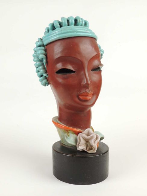 GOLDSCHEIDER ART DECO BUST of a stylised lady, turquoise and orange glaze, on wooden drum base with maker's plaque insetProvenance: The collection of Philip Clarkson