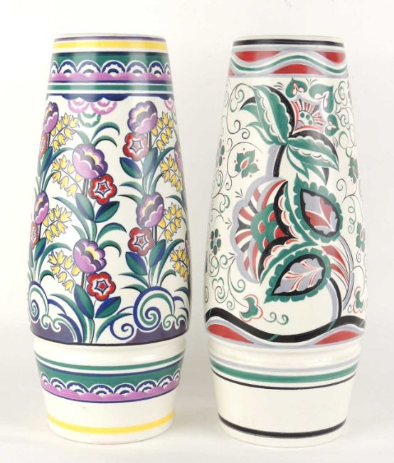 POOLE VASE, decorated by G. Haskins (MK47), 42.5cms (h); together with a similar shaped Poole vase, signed N. Blackmore, 42.5cms (h) (2)Provenance: The collection of Philip ClarksonComments: both in good condition