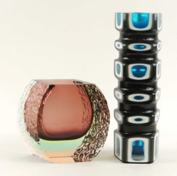 MURANO FACETED COLOURED OVERLAY GLASS VASE in amethyst and white, lined with blue, 29.5cms (h); together with a Murano amethyst, clear, and textured glass slab vase, 16cms (h) (2)Provenance: The collection of Philip ClarksonComments: good condition; smaller vase with small chip to the foot rim