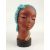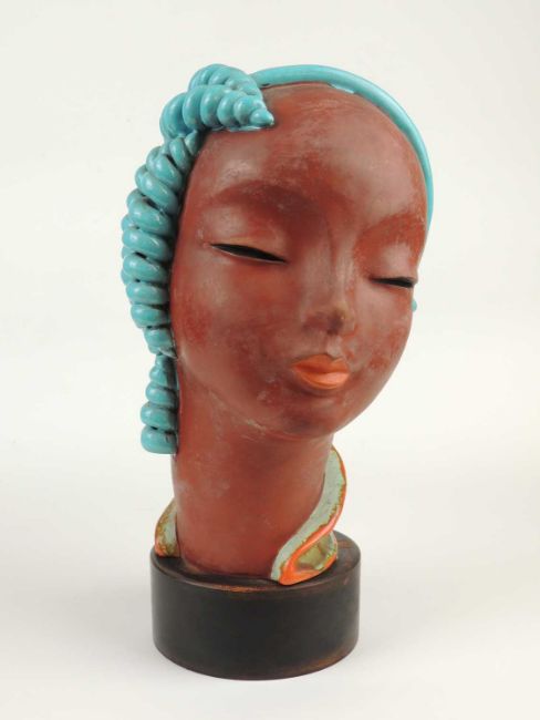 GOLDSCHEIDER ART DECO BUST of a stylised lady, turquoise and orange glaze, on ebonised wood drum base with maker's plaque inset, 35cms (h)Provenance: The collection of Philip Clarkson