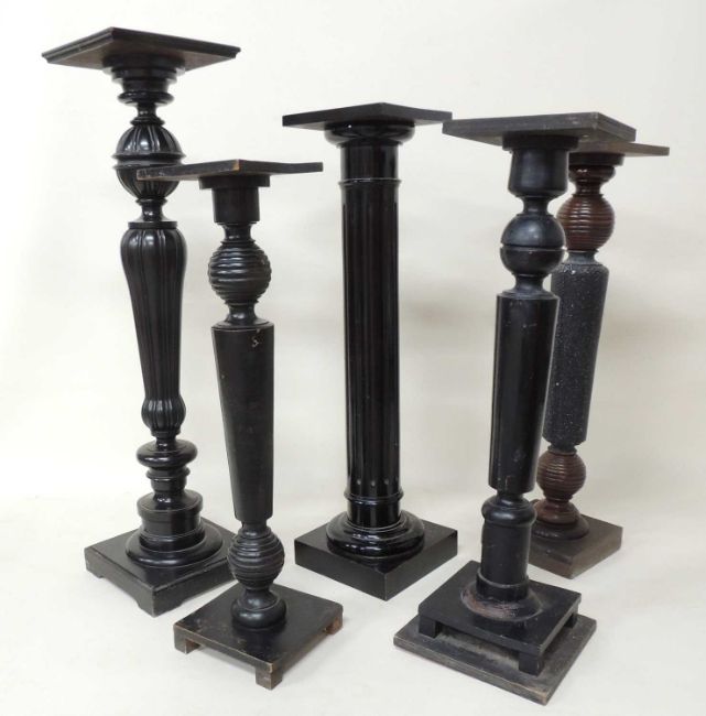 FOUR EBONISED WOODEN TORCHÈRES, and a similar torchère, including ball and baluster example, 120cms (h), top 30cms², two similar 94cms (h) and 99cms (h), column torchère 105cms (h), and one with a splash painted base 99cms (h) (5)Provenance: The collection of Philip Clarkson