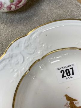 SWANSEA PORCELAIN ARMORIAL DISH & JUG, comprising moulded border soup plate with gilded bird crest to centre; and a Swansea-style floral fluted cream jug with gilt borders and handle, possibly later decorated with insects and roses, forme with red stencilled mark, latter bearing painted mark (2)Provenance: deceased estate HampshireComments: please examine