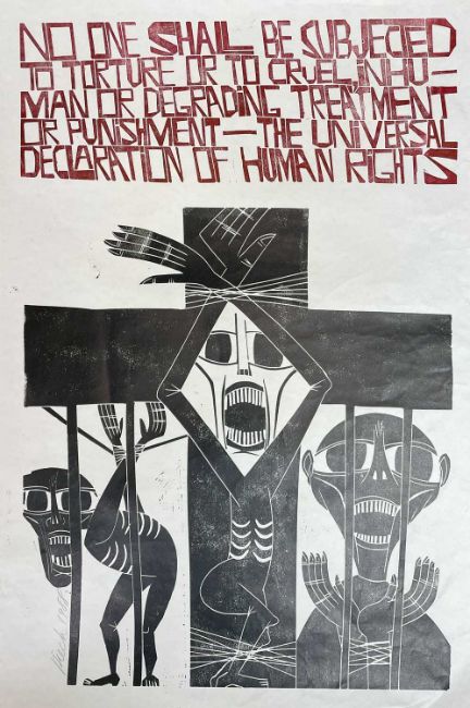 ‡ PAUL PETER PIECH (American, lived/worked Wales, 1920-1996) limited edition woodcut prints (5) - all five with the same theme about human rights and abolishing torture, all signed, all dated '87/'88, all roughly the same size 76 x 51cmsProvenance: private collection South WalesComments: all unframed, one with large water stain, most have creasing, small tears and tape residue, viewing recommended