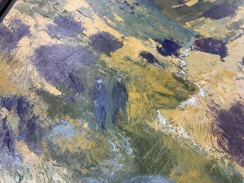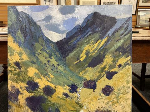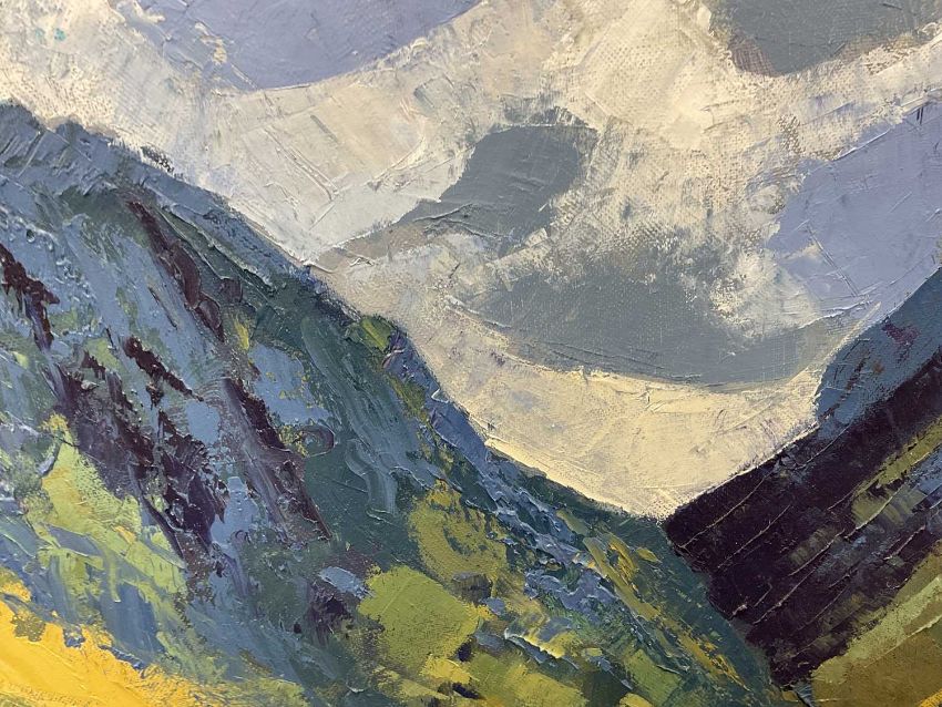 GWILYM PRICHARD (1931-2015) oil on canvas - mountainous landscape with two figures walking, signed and dated verso 2001, 92 x 60cmsProvenance: estate of Claudia Williams, no ARR applicableComments: unframed canvas