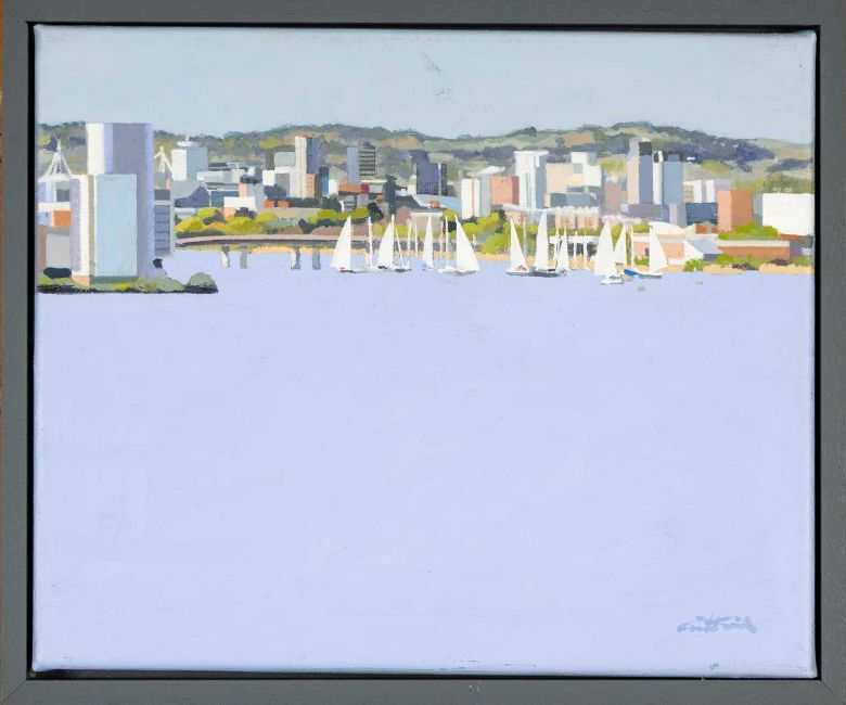 PATRICIA AITHIE (Welsh, b. 1957) oil on canvas - Cardiff Bay from Penarth, signed, 25 x 30cmsProvenance: Private collection CardiffAuctioneer's Notes: Patricia Aithie graduated Cardiff & Canterbury Colleges of Art (1980) under John Bellany, Gillian Ayres and others. Widely exhibited in the UK and Middle East, including Martin Tinney Gallery, Mitras Gallery, and Albany Gallery amongst others. Lecturer in Ancient and Modern Art History, Director of Ffotograff (1988-2008), freelance Press Photographer for most national newspapers and lifestyle magazines, Writer, Producer and Presenter for four BBC programs on Yemen. Author and photographer on numerous travel books including Yemen: Jewel of Arabia, The Burning Ashes of Time, The Highlands and Islands of Scotland, Morgannwg/Glamorgan, etc.Comments: framed glazed ready to hang, no ARR.